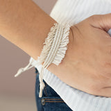 Strands of shiny white twine-like cording decoratively knot around the wrist, creating a rustic fringed centerpiece. Features an adjustable sliding knot closure.
