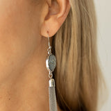 Flecks of shells are encased in a glassy gray bead that is encased in a hammered silver frame. A silver chain tassel swings from the bottom of an iridescent frame, creating an ethereal display. Earring attaches to a standard fishhook fitting.