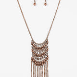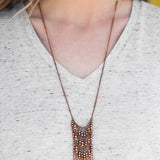 Threaded along metallic rods, dainty copper beads link together, creating a dramatic mesh pendant. Brushed in an antiqued shimmer, copper chains stream from the bottom of the edgy pendant for a bold industrial finish. Features an adjustable clasp closure.
