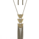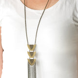 Radiating in linear textures, antiqued brass plates connect down the chest, creating a tribal inspired pendant. Glistening brass chains swing from the bottom of the stacked pendant, adding a whimsical tassel to the indigenous palette. Features an adjustable clasp closure.