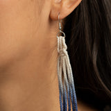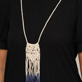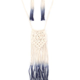 Gradually fading from white to Blue Depths, strands of twine-like cording delicately knot in braid into a decorative macramé inspired pendant across the chest. Features an adjustable sliding knot closure.