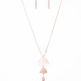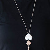 A dainty rose gold tassel sways from the bottom of two triangular discs, one white shell-like and one rose gold, for a flirty pendant at the end of a lengthened rose gold snake chain. Features an adjustable clasp closure.