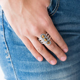 Infused with glassy tiger's eye stones, a studded silver frame is pressed into the center of a layered silver band for a seasonal look. Features a stretchy band for a flexible fit.