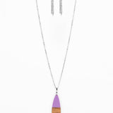 Dipped in a purple finish, a wooden teardrop pendant swings from the bottom of a lengthened silver chain for a colorful earthy look. Features an adjustable clasp closure.