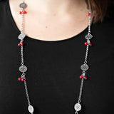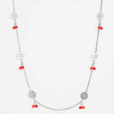 Featuring glassy and polished finishes, dainty red beads join ornate silver frames along a shimmery silver chain for a whimsical look. Features an adjustable clasp closure. Sold as one individual necklace. Includes one pair of matching earrings.
