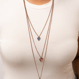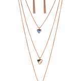 Glassy oil spill, coppery aurum, and coppery triangular gems gradually increase in size as they swing from the bottoms of extended copper chains, layering into an edgy shimmer across the chest. Features an adjustable clasp closure.