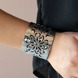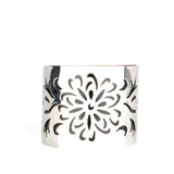 A thick piece of black leather peeks out beneath an airy floral pattern stenciled into a thick silver cuff, creating a whimsical display around the wrist.